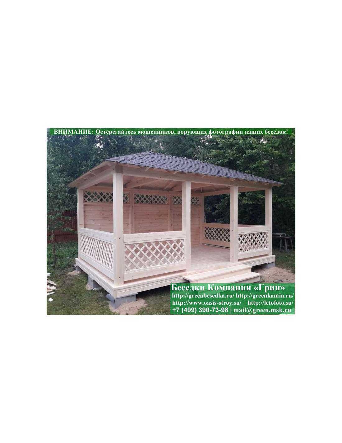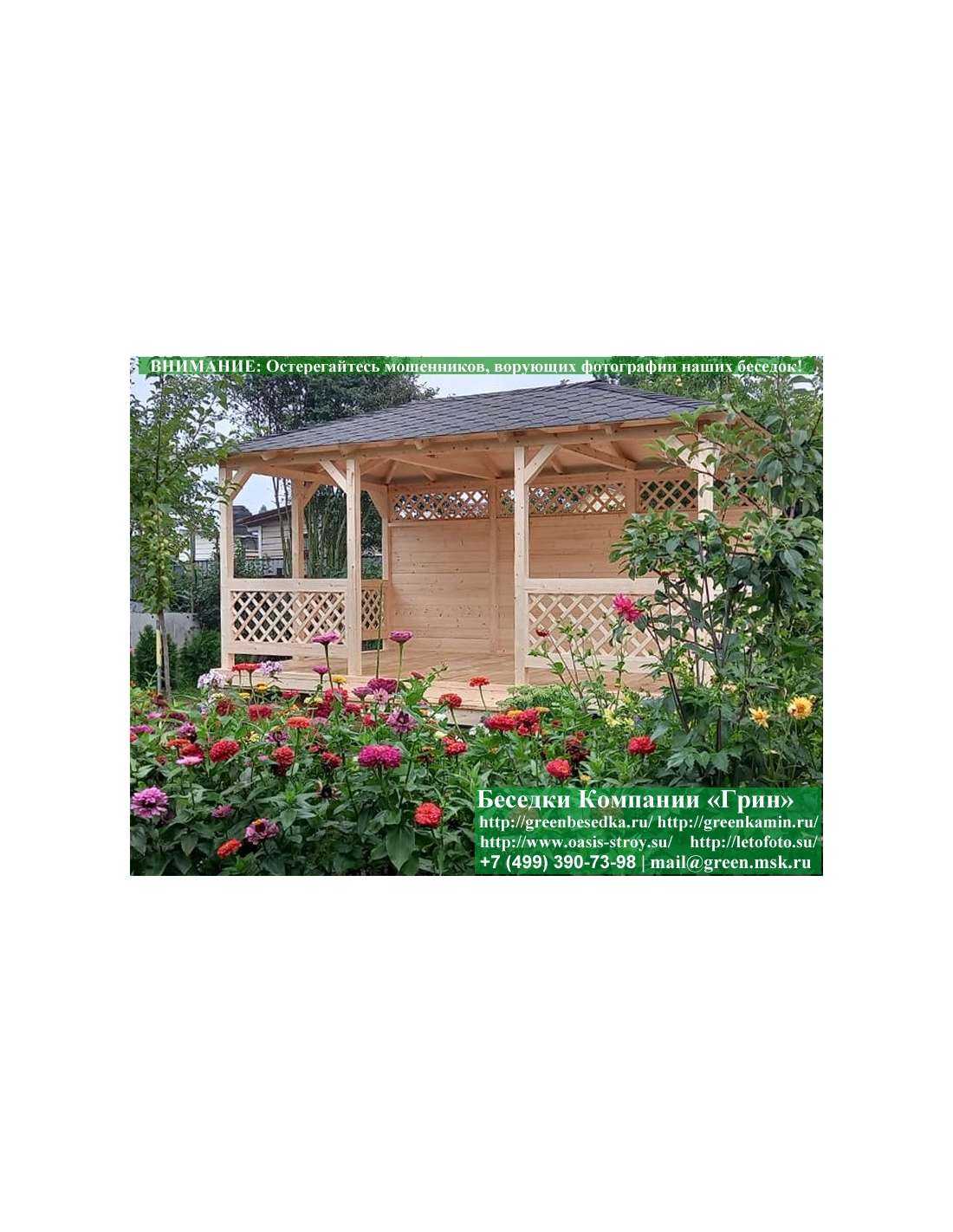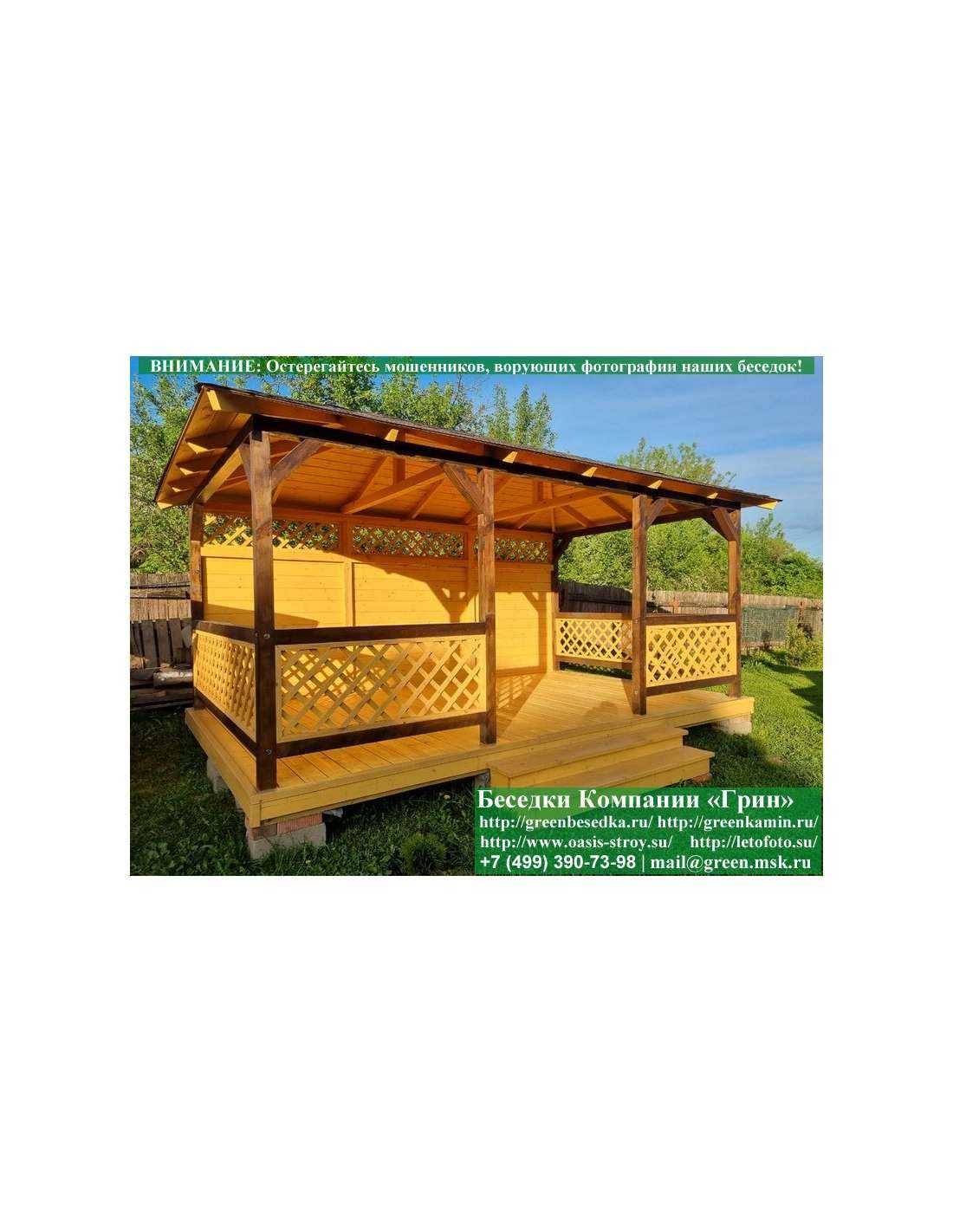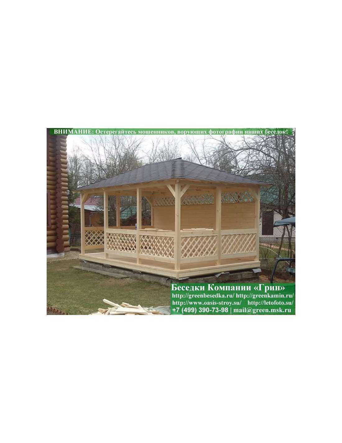 Летняя беседка для дачи 3х5 метров изготавливается из сосны, со сплошной одноярусной четырехскатной (вальмовой) крышей. При строительстве беседок используется сухой материал камерной сушки. В качестве несущих стоек используется строганый брус 90х90 мм. Стандартный вариант беседки: задняя стенка глухая, с перголами по верху (32 см). Открытая выше подоконника с 3-х сторон. Каждую открытую сторону можно закрыть перголами или сделать глухой. Перголы (решетки) закупаются у мастера, который занимается их изготовлением 15 лет. Сухой материал тщательно полируется. На пол кладется сухая строганая доска 35 мм. На крышу укладывается мягкая черепица "Технониколь": Коричневых, Зеленых, Бордовых, Серых цветов. Срок изготовления и установки беседки на участке составляет 5-10 дней. Беседки поставляются в не крашеном виде. Возможна покраска беседок краской, лаком или обработка антисептиком.