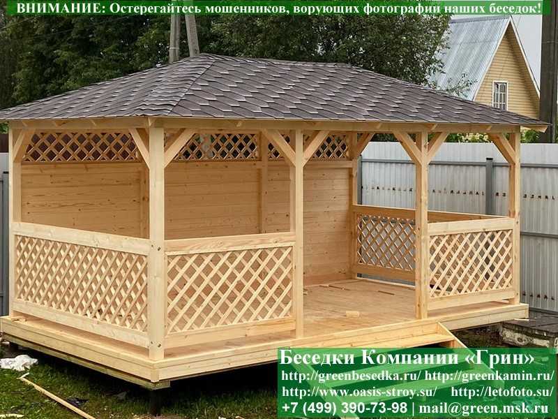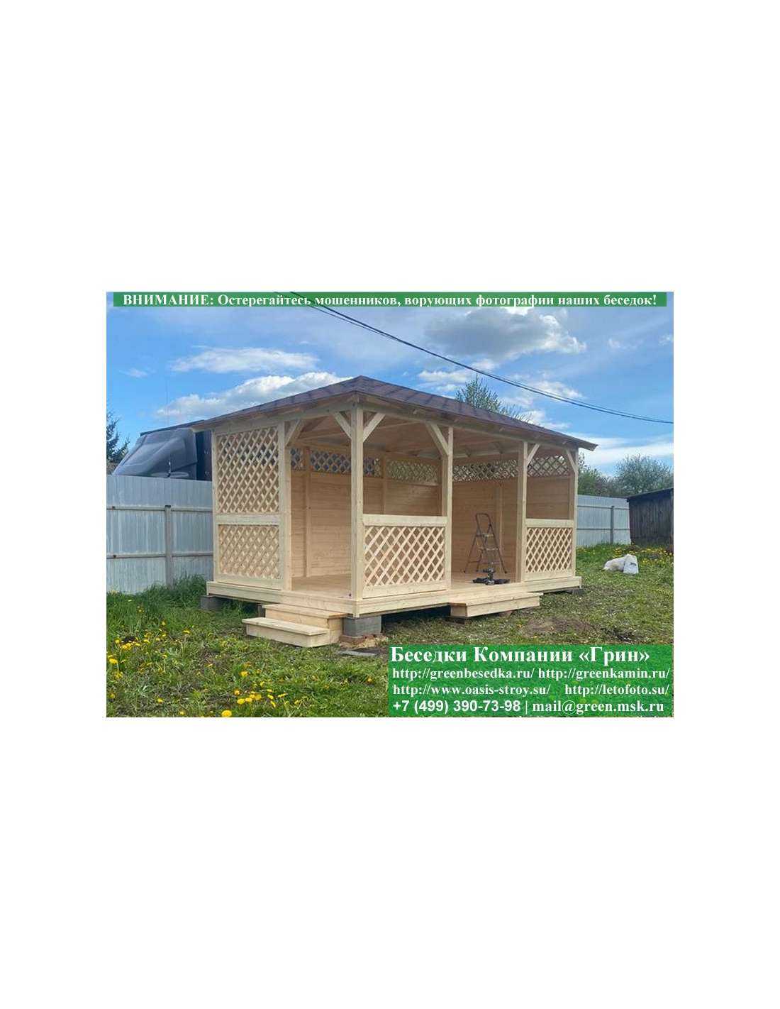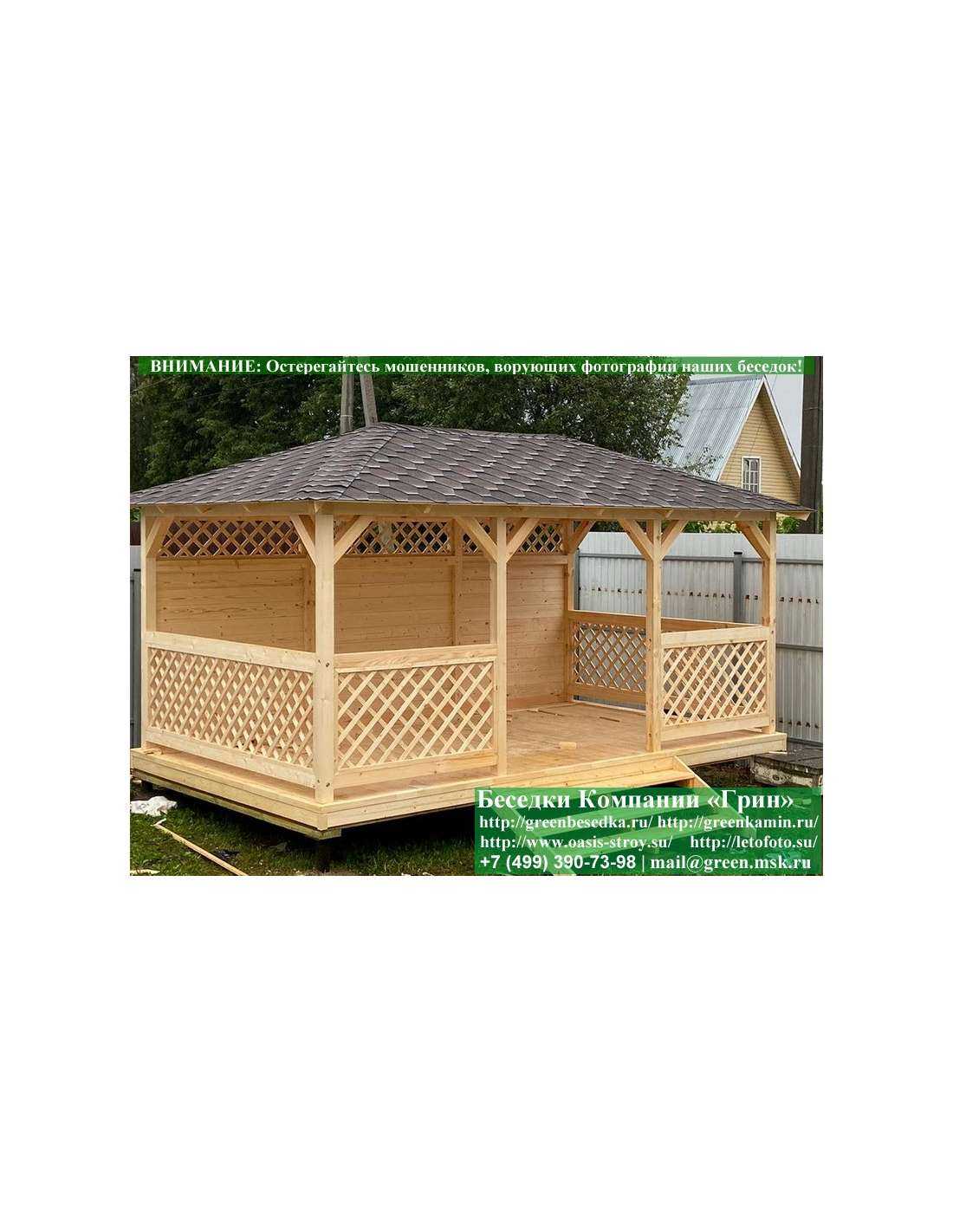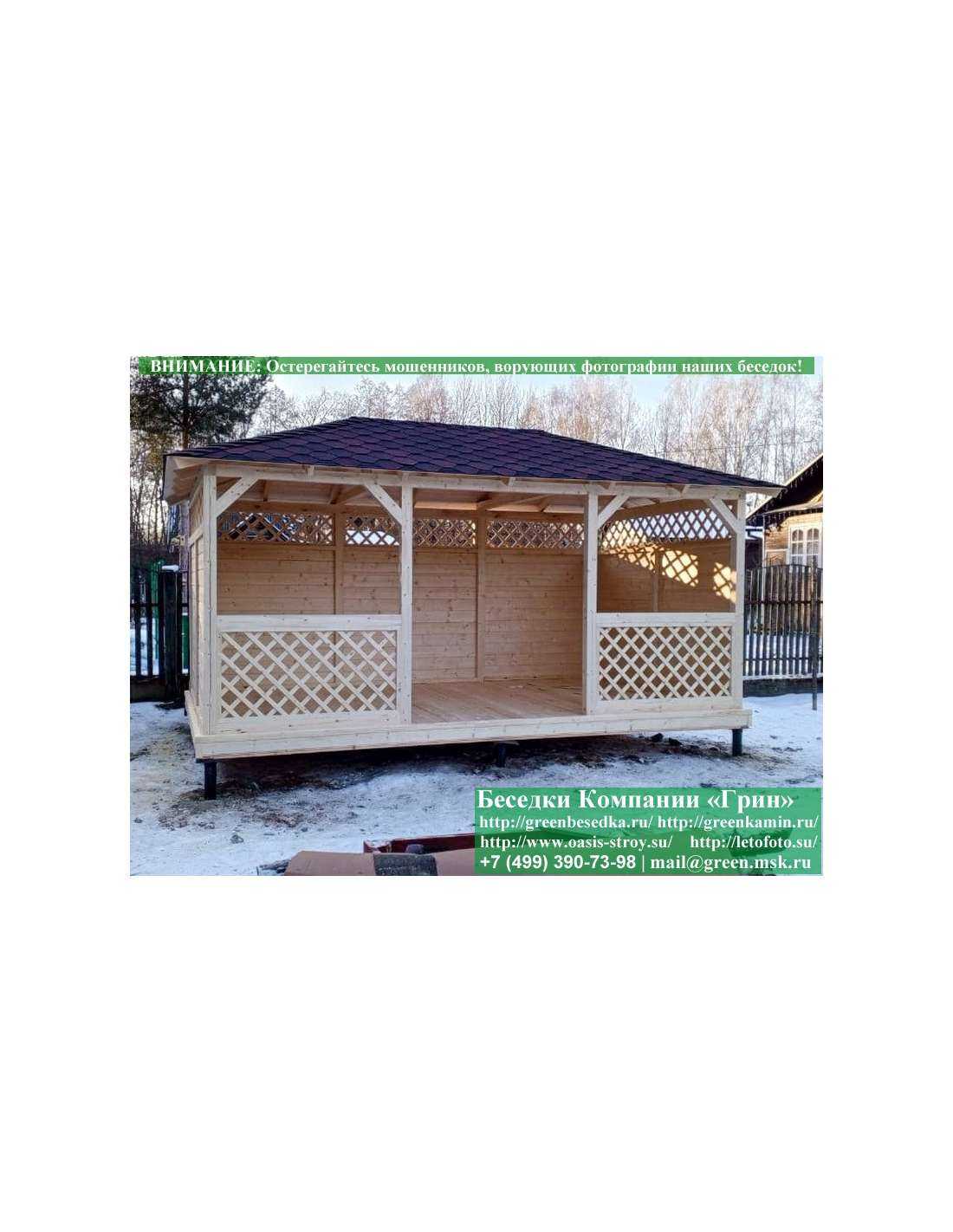 Летняя беседка для дачи 3х5 метров изготавливается из сосны, со сплошной одноярусной четырехскатной (вальмовой) крышей. При строительстве беседок используется сухой материал камерной сушки. В качестве несущих стоек используется строганый брус 90х90 мм. Стандартный вариант беседки: задняя стенка глухая, с перголами по верху (32 см). Открытая выше подоконника с 3-х сторон. Каждую открытую сторону можно закрыть перголами или сделать глухой. Перголы (решетки) закупаются у мастера, который занимается их изготовлением 15 лет. Сухой материал тщательно полируется. На пол кладется сухая строганая доска 35 мм. На крышу укладывается мягкая черепица "Технониколь": Коричневых, Зеленых, Бордовых, Серых цветов. Срок изготовления и установки беседки на участке составляет 5-10 дней. Беседки поставляются в не крашеном виде. Возможна покраска беседок краской, лаком или обработка антисептиком.