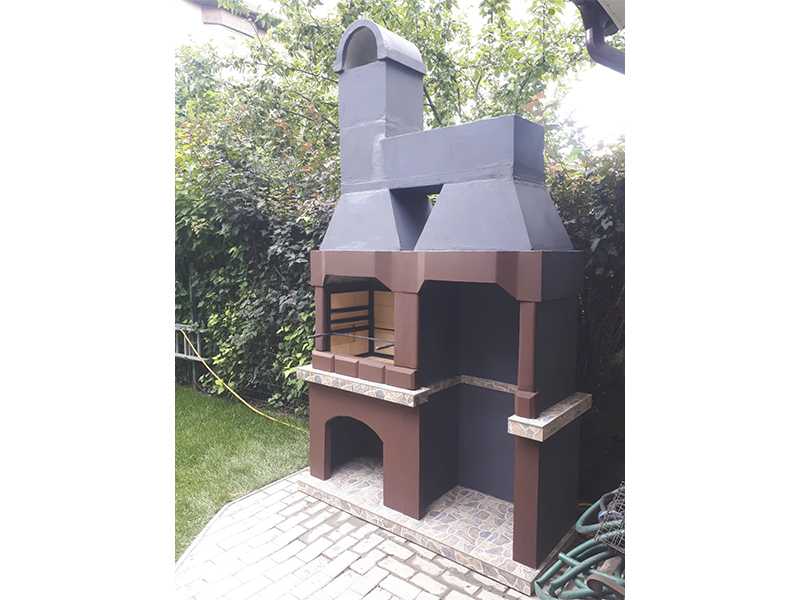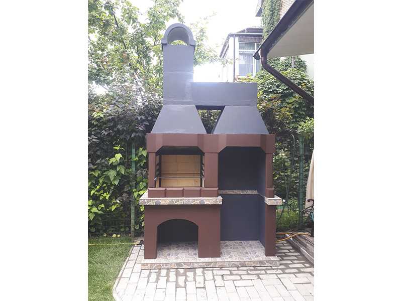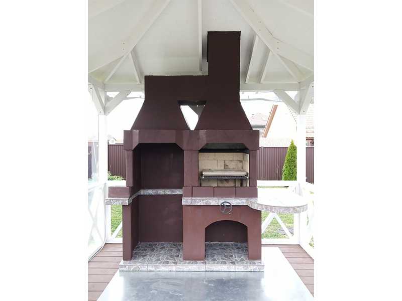 Печь этой модели имеет простой, лаконичный дизайн. Мы выбрали нейтральные цвета: коричневый, серый нескольких оттенков. А это означает, что подолгу искать место для конструкции не придется. Она впишется в любую беседку и на любой участок.